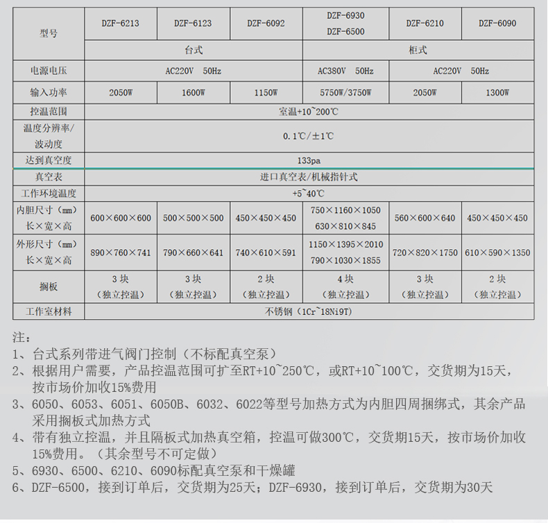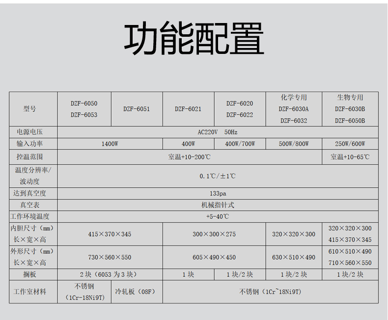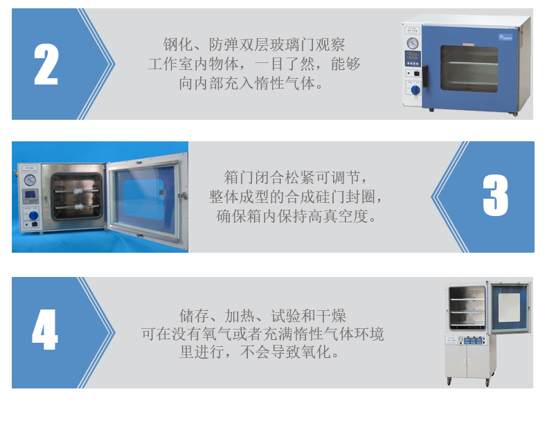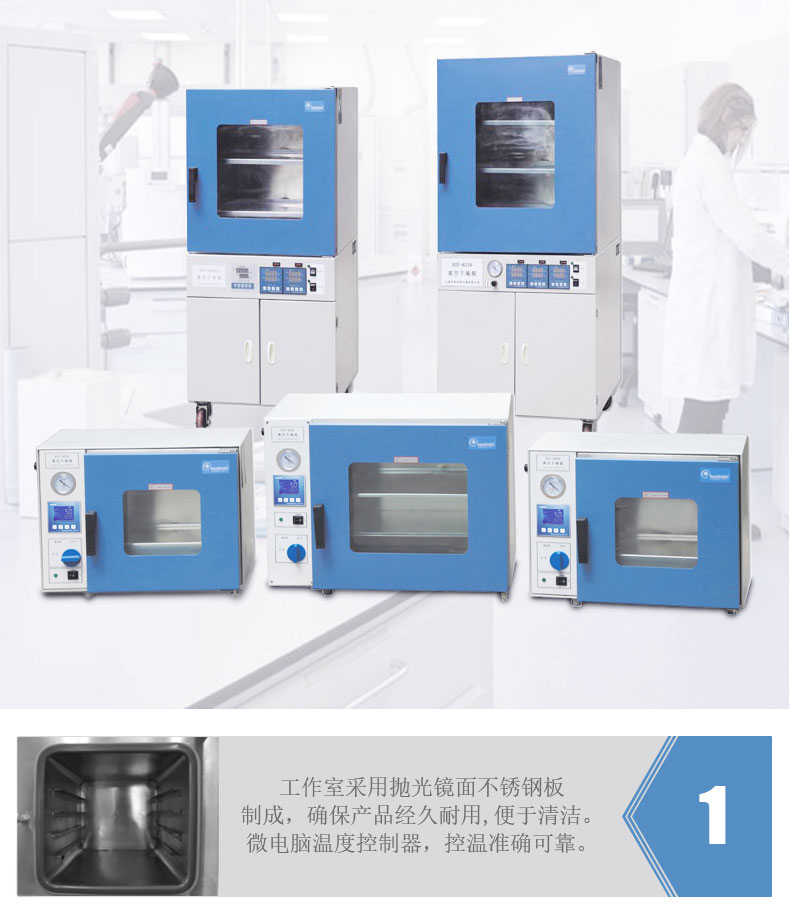 真空干燥箱工作室材料采用不銹鋼,外形為方型臥式,比圓形工作室擴大了使用空間。 真空干燥箱加熱方式為室外環繞加熱,使溫度更均勻,避免了有機物品與明火的接觸產生燃燒,數字顯示設定溫度和當前溫度,智能PID控制,具有控溫準確、精度高等特點。